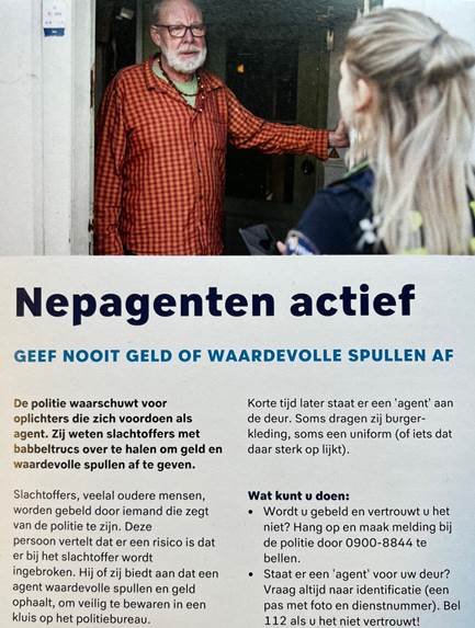 | VALSE BANKMEDEWERKER: Een stukje uit een aangifte: De persoon aan de andere kant van de lijn stelde zich voor als bankmedewerker van de xxxxxxbank. Zijn naam was xxxxxx xxxxxxx. Ze vroegen, aan de telefoon, aan mij of ik interesse had om te gaan internetbankieren, dit wilde ik niet. Ik zei tegen de persoon dat mijn dochter hier voor is gemachtigd en dat ik hier niet over ga. De persoon zei ook nog dat er 90 euro van mijn rekening was afgeschreven. Toen zei ik tegen die persoon dat kan niet, ik weet niet waar je het over hebt. Hierna zei de persoon aan de andere kant van de telefoon dat er iemand onderweg was en die staat zo voor uw deur en dan gaat hij foto’s maken van de deur sluitingen voor de beveiliging. Hierna zei hij dat ik mijn sieraden moest pakken, omdat dat nodig was voor de beveiliging. Hier ging hij dan ook foto’s van maken. Sieraden zijn meegegeven. |